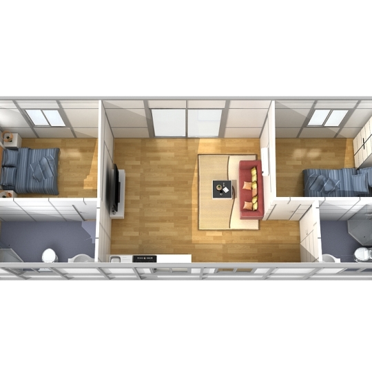 Butterfly Modular Houses T221H offers you 2 bedrooms, 2 bathrooms, and a pre-fit kitchen. It is ideal for a young couple, or seniors who want to have affordable accommodation quickly.