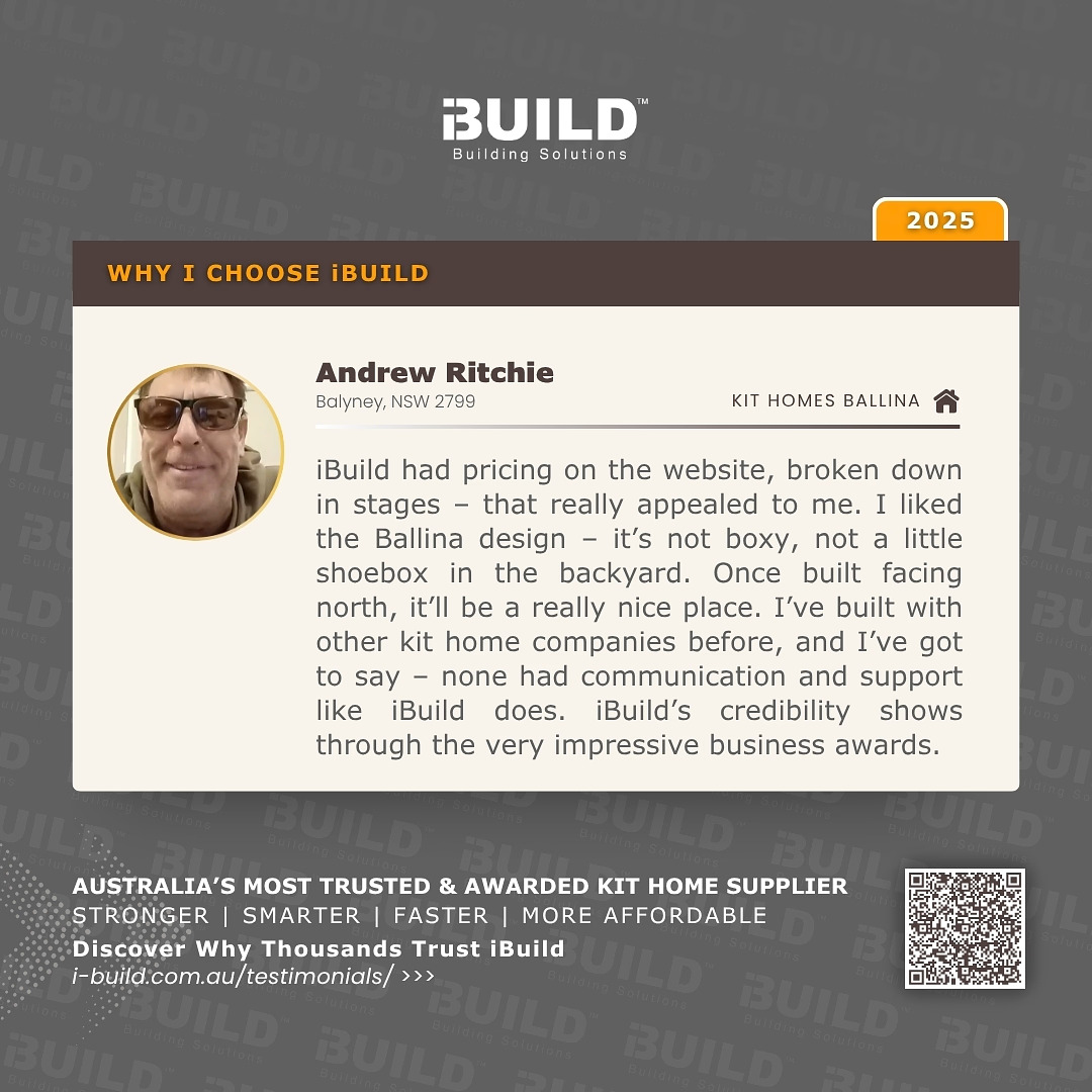 iBuild had pricing on the website, broken down in stages – that really appealed to me. I liked the Ballina design – it’s not boxy, not a little shoebox in the backyard. Once built facing north, it’ll be a really nice place. I’ve built with other kit home companies before, and I’ve got to say – none had communication and support like iBuild does. iBuild’s credibility shows through the very impressive business awards.